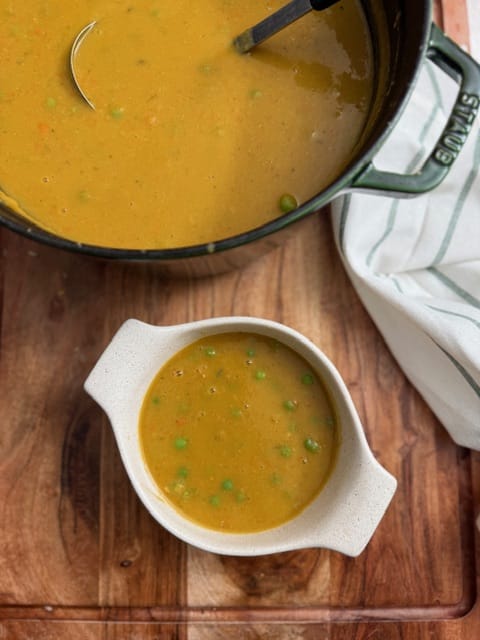If you’re looking for more of a classic split pea soup, this is not your recipe lol. Yes, I’ve done the classic smoky version (using smoked turkey leg to make it kosher!), and it’s a VERY popular recipe here on the blog for years now! But I wanted to lighten it up, and make the texture a little less lumpy and a little more creamy! The result: a creamy base with pops of pea pearls that add the perfect burst of sweetness to every bite!