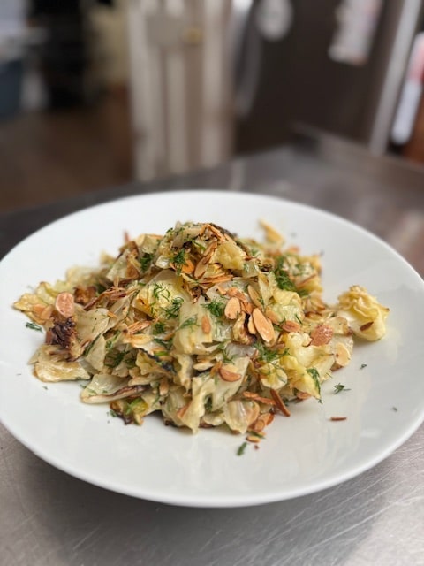 When the cabbage is done, toss with some of the tahini dressing until coated. Add most of the dill and sliced almonds. Transfer to a serving bowl and garnish with additional dill and toasted almonds.