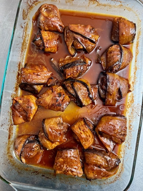Raise the oven temperature to 400 degrees. Transfer the eggplant parcels to a baking dish and add the pomegranate sauce. Cover with parchment paper and foil and bake for about 45-50 minutes, flipping halfway through and basting occasionally with the sauce. Uncover and broil for a few minutes until the eggplant caramelizes around the edges.